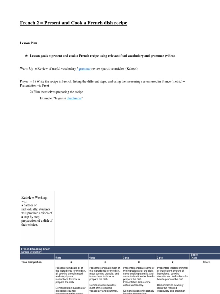 Lesson goals = present and cook a French recipe using relevant food vocabulary and grammar (video)