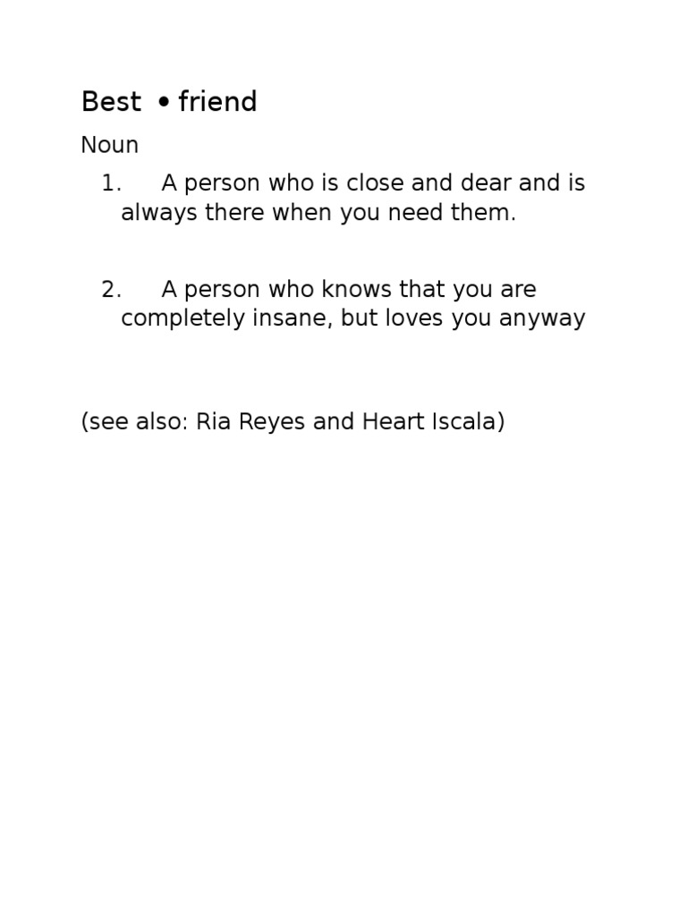 Best friend refers to a person who is close and dear, always there when needed. It also describes someone who knows you are insane but loves you anyway. The document provides two definitions for best friend and includes an example of two best friends, Ria Reyes and Heart Iscala.