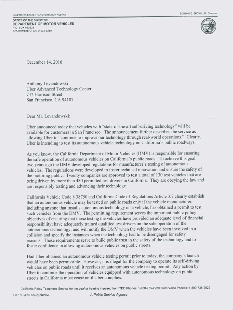 A letter from the California Department of Motor Vehicles detailing why Uber is violating state regulations around the testing of autonomous vehicles and ordering it to cease, under penalty of legal action