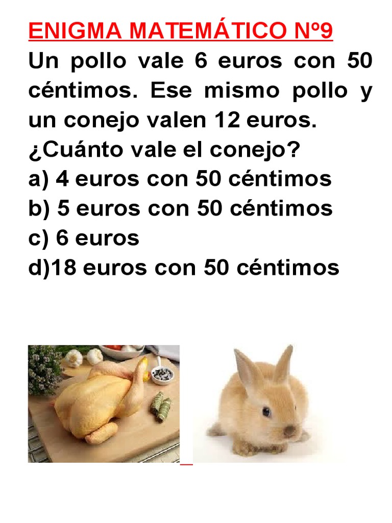 cntimos. Ese mismo pollo y un conejo valen 12 euros. Cunto vale el conejo? a) 4 euros con 50 cntimos b) 5 euros con 50 cntimos c) 6 euros d)18 euros con 50 cntimos