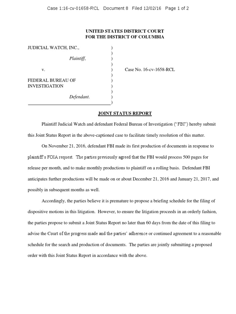 Plaintiff Judicial Watch and defendant Federal Bureau of Investigation (FBI) hereby submit