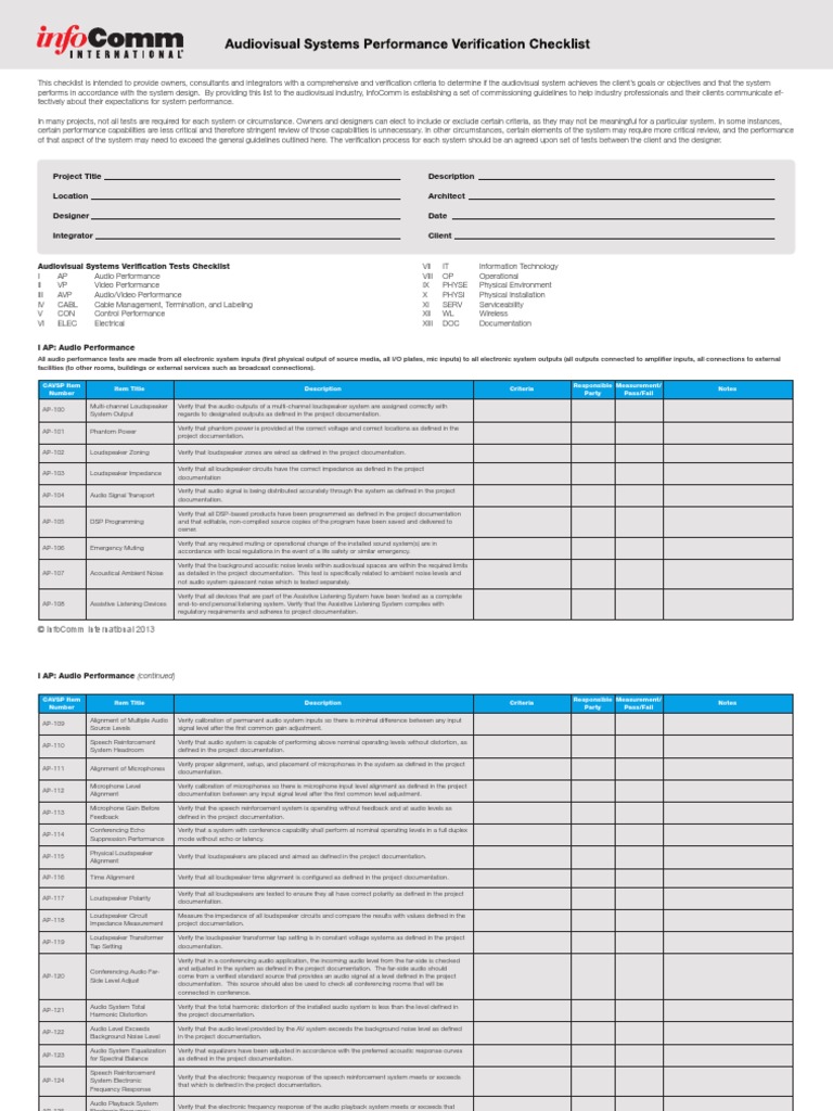 performs in accordance with the system design. By providing this list to the audiovisual industry, InfoComm is establishing a set of commissioning guidelines to help industry professionals and their clients communicate effectively about their expectations for system performance.