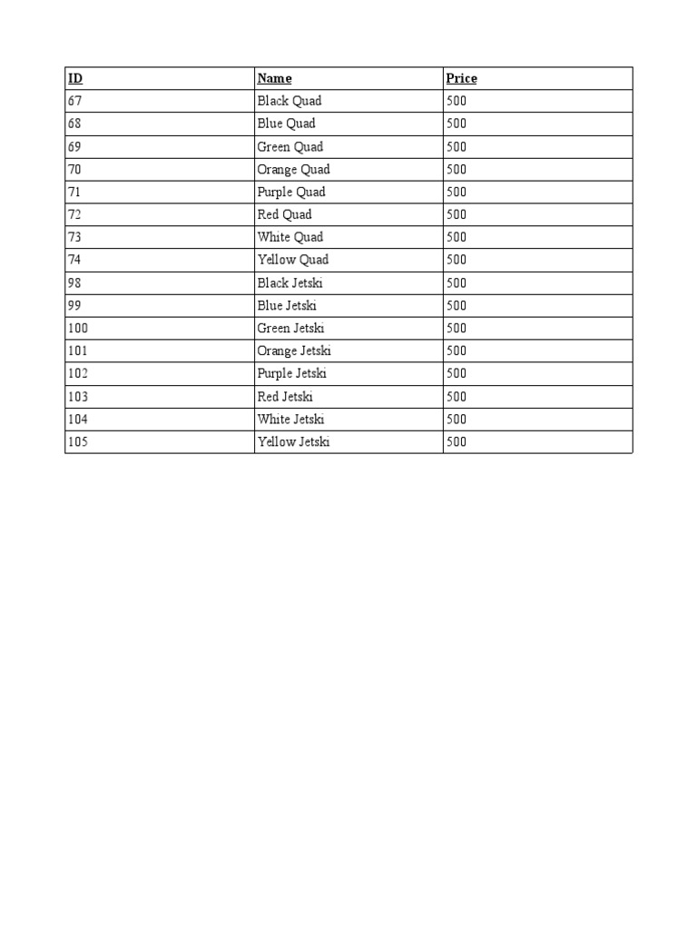 The document lists various items for sale including quad bikes and jetskis in different colors. All quad bikes and jetskis have an ID number and price of $500 regardless of color. There are 8 quad bikes and 8 jetskis listed, each with a unique color but identical price.