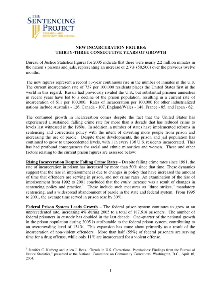continued to grow to unprecedented levels, with 1 in every 136 U.S. residents incarcerated. This