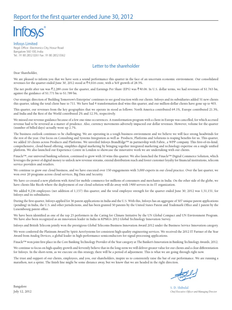 Infosys is concerned about the environment and utilizes natural resources in a sustainable way. To this end, the quarterly report is sent via email to