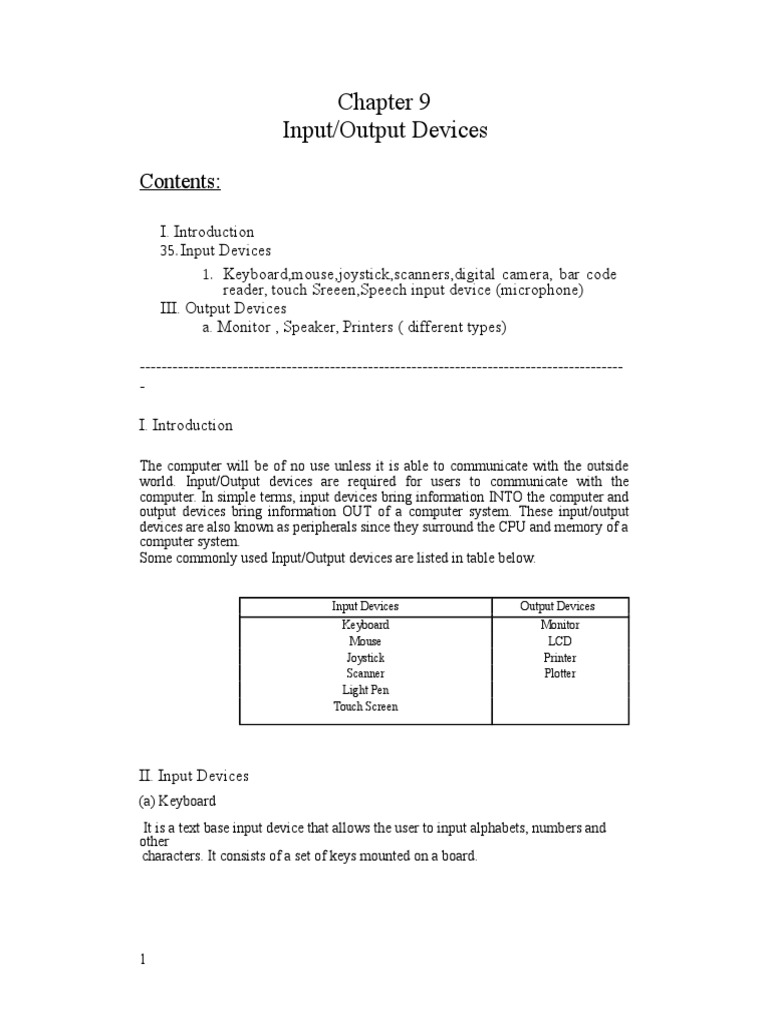 detailed listing of the various types of input devices and the output devise. The