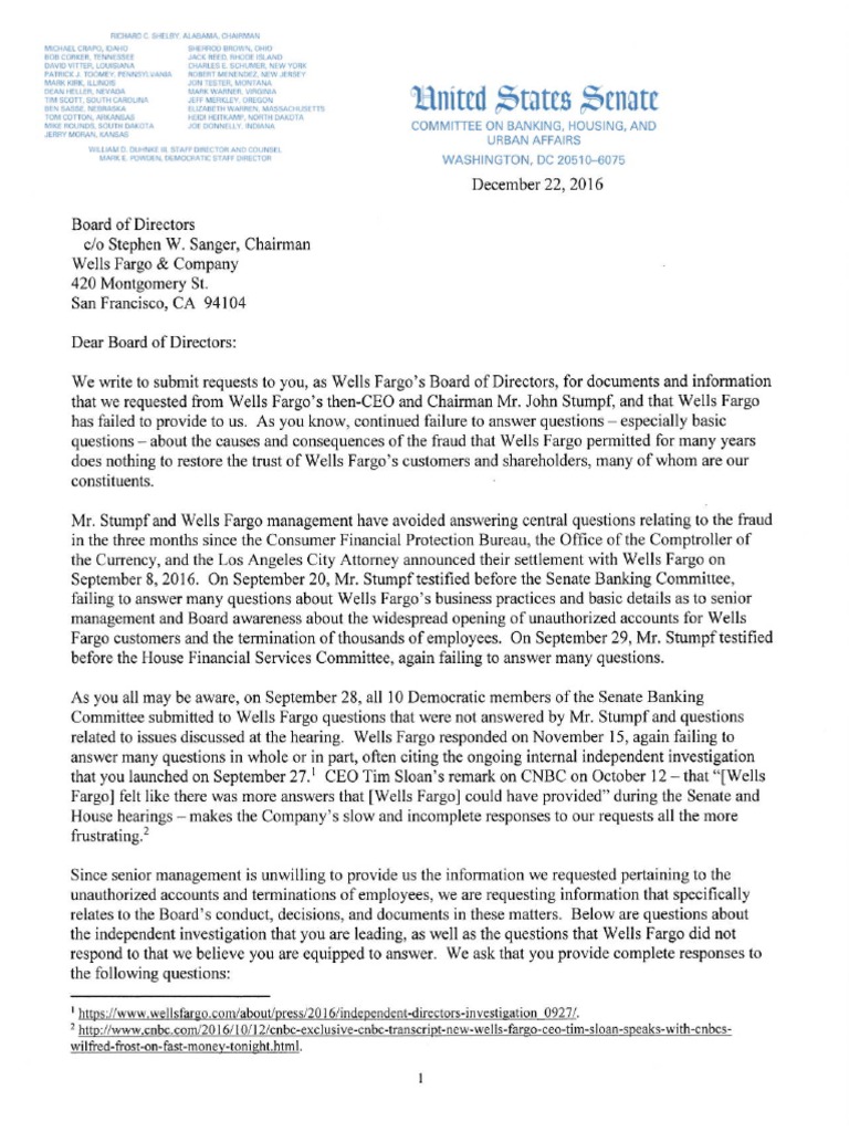 Democrats on the U.S. Senate Banking Committee today called on Wells Fargo’s board of directors to respond to questions that the bank’s management has failed to answer following a scandal over its fraudulent sales practices.