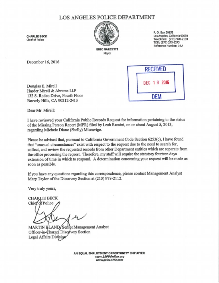 LAPD Chief Charlie Beck notifies Leah Remini's attorney that the department will take two additional weeks to address Leah's records request regarding Shelly Miscavige.