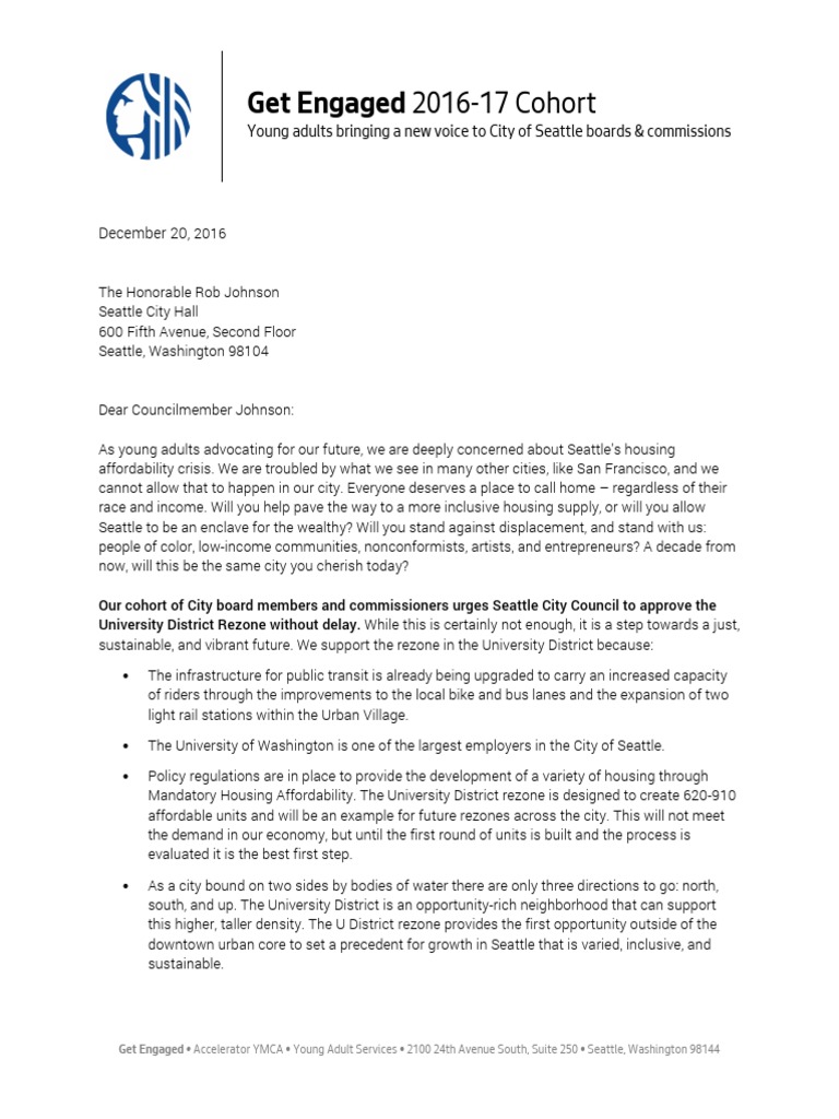 2016 The Honorable Rob Johnson Seattle City Hall 600 Fifth Avenue, Second Floor Seattle, Washington 98104 Dear Councilmember Johnson: As young adults advocating for our future, we are deeply concerned about Seattle’s housing affordability crisis. We are troubled by what we see in many other cities, like San Francisco, and we cannot allow that to happen in our city. Everyone deserves a place to call home – regardless of their race and income. Will you help pave the way to a more inclusive housing supply, or will you allow Seattle to be an enclave for the wealthy? Will you stand against displacement, and stand with us: people of color, low-income communities, nonconformists, artists, and entrepreneurs? A decade from now, will this be the same city you cherish today?