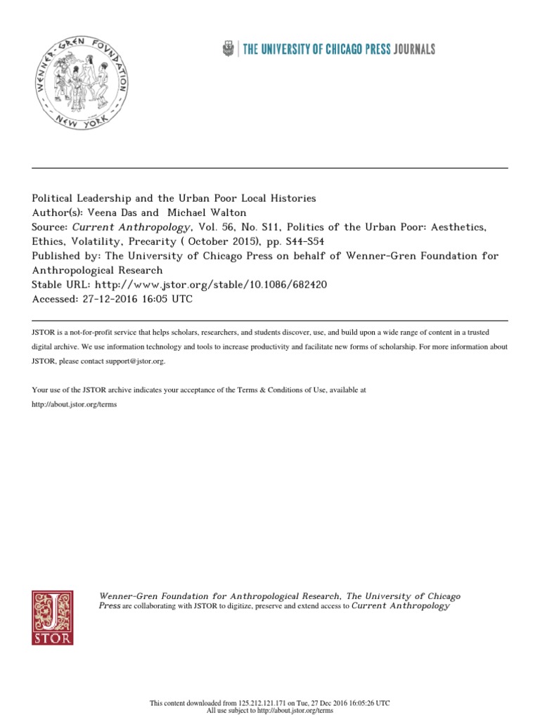 Das, Veena, and Shalini Randeria. 2015. Politics of the urban poor: aesthetics, ethics, volatility, precarity: an introduction to supplement 11. Current