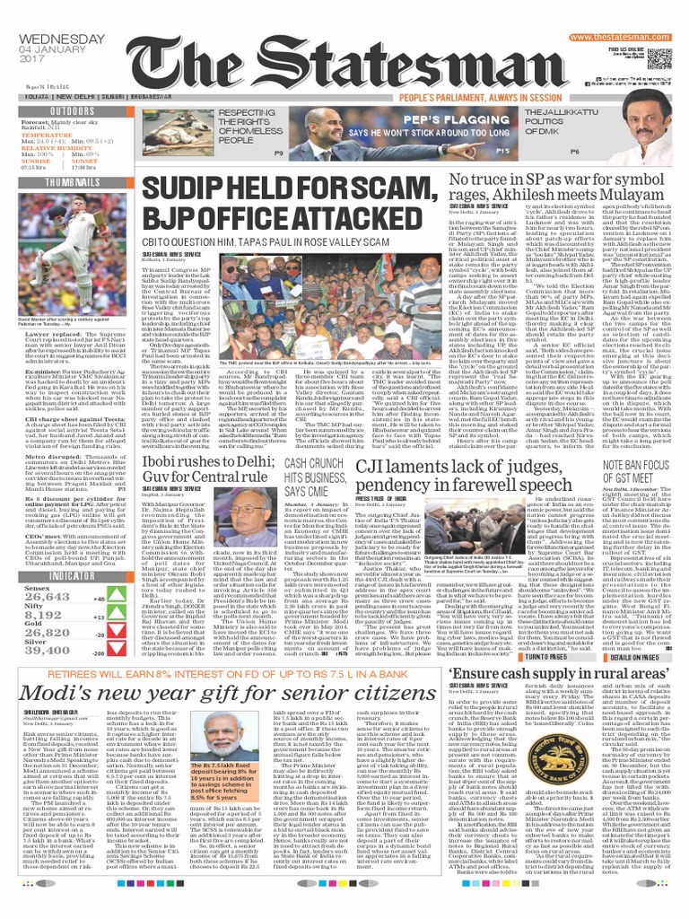 Printed and published by SHIVAJI SAMADDAR for THE STATESMAN LTD, Statesman House, 148 Barakhamba Road, New Delhi Editor: RAVINDRA KUMAR, Resident Editor: USHA MAHADEVAN Printed at The Indian Express Pvt Ltd, A-8, Sector 7, NOIDA 201301(UP). The Statesman Ltd. RNB REG. No. M-8905,RNI No. 507/57