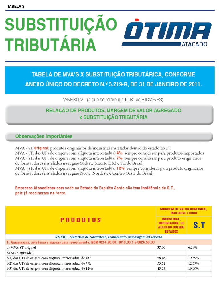 TABELA DE MVAS x SUBSTITUIO TRIBUTRICA, CONFORME