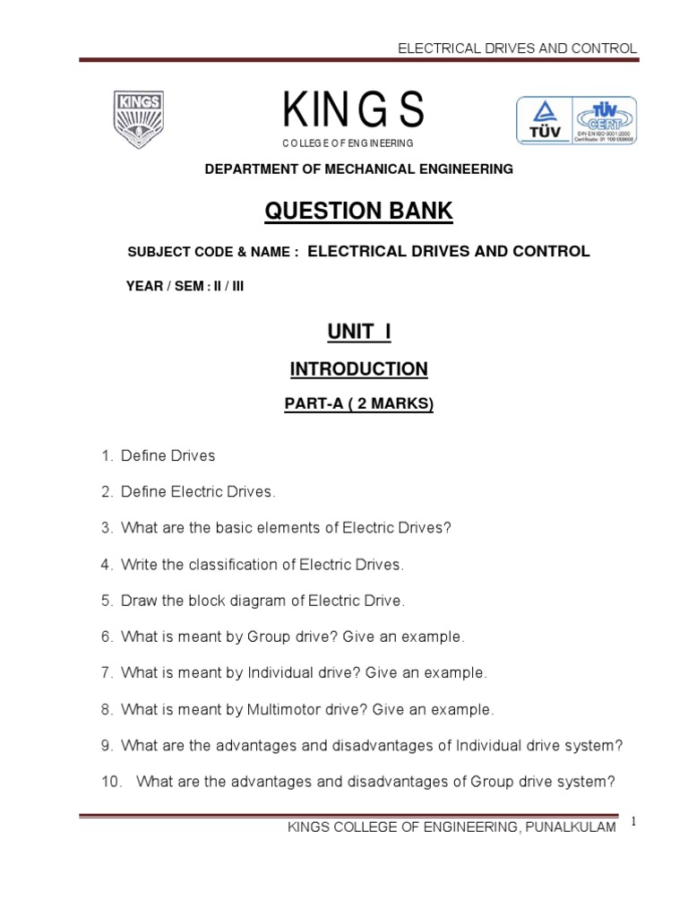 SUBJECT CODE & NAME : ELECTRICAL DRIVES AND CONTROL