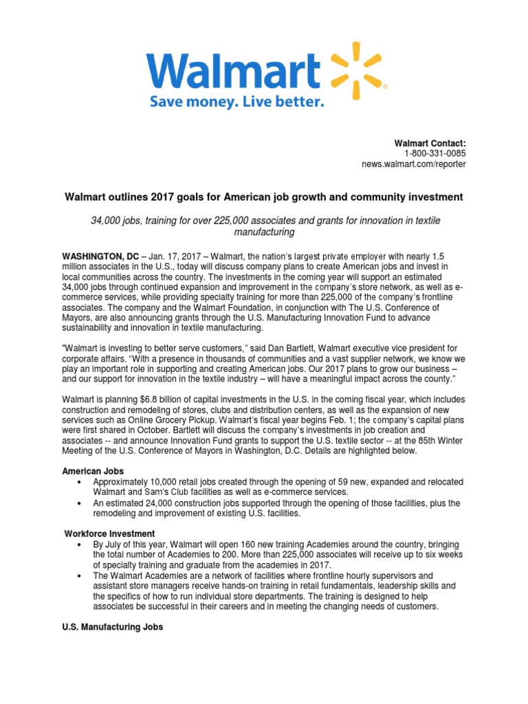 WASHINGTON, DC Jan. 17, 2017 Walmart, the nations largest private employer with nearly 1.5