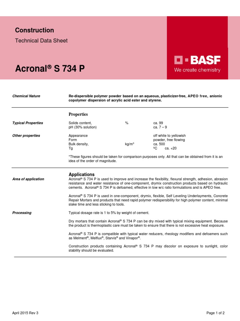 cements. Acronal S 734 P is defoamed, effective in low w/c ratio formulations and is APEO free.