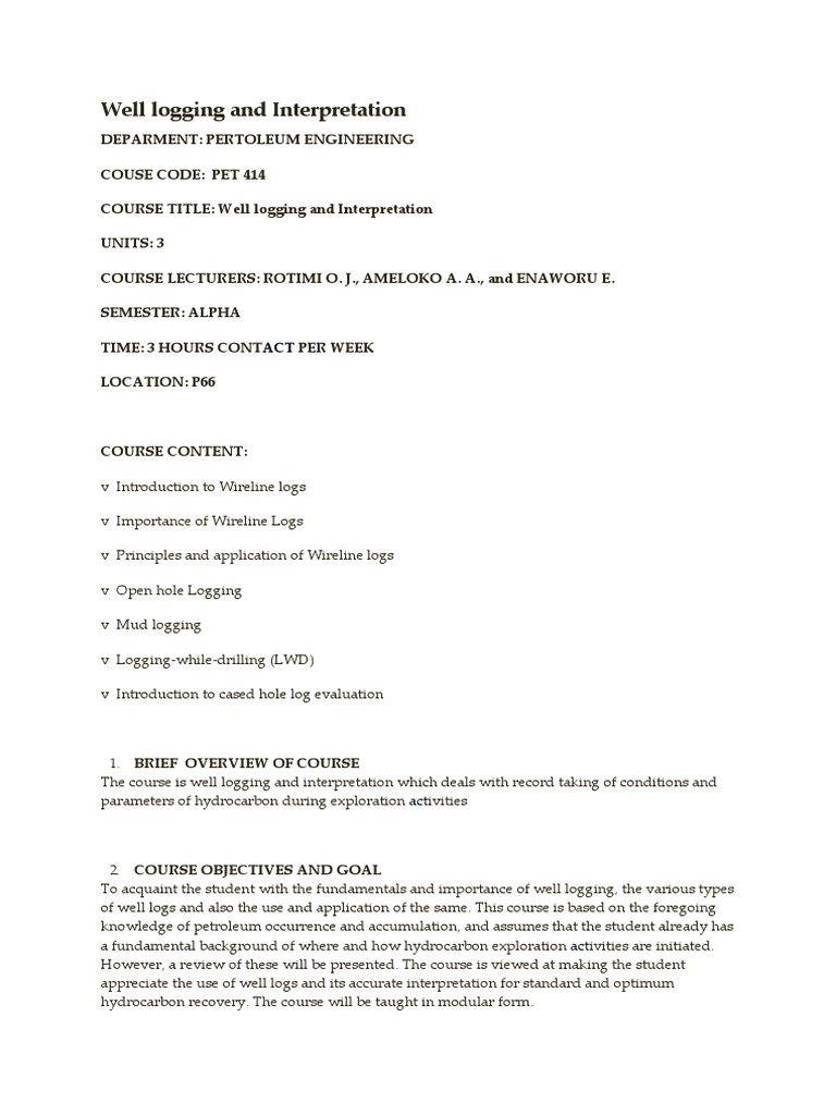 The course is well logging and interpretation which deals with record taking of conditions and