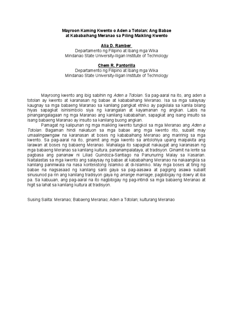 at Kababaihang Meranao sa Piling Maikling Kwento