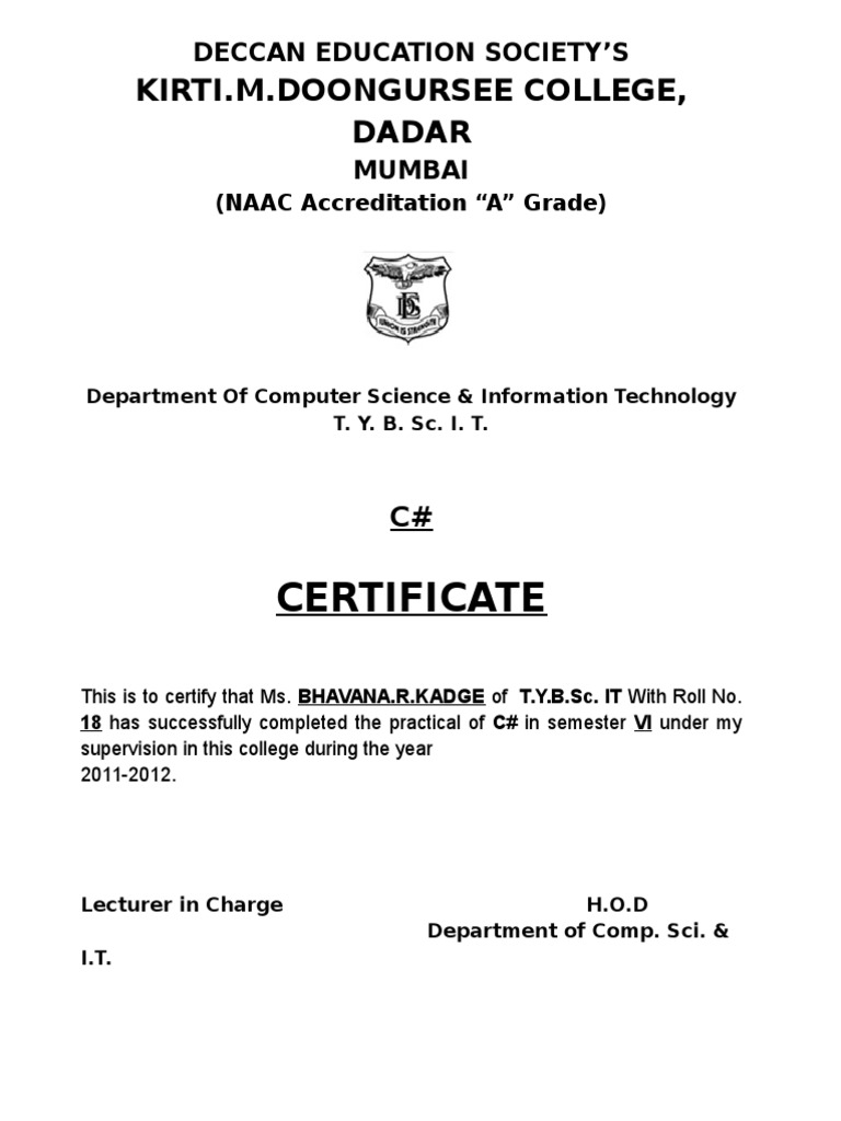 This is to certify that Ms. BHAVANA.R.KADGE of T.Y.B.Sc. IT With Roll No.