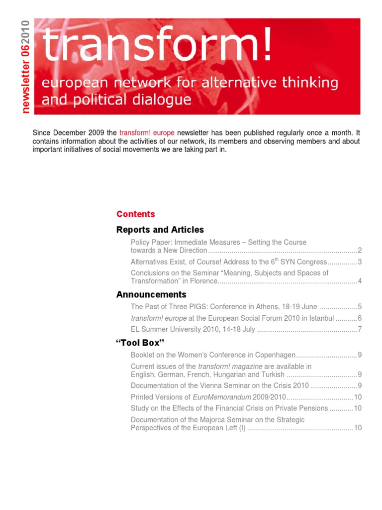 Since December 2009 the transform! europe newsletter has been published regularly once a month. It