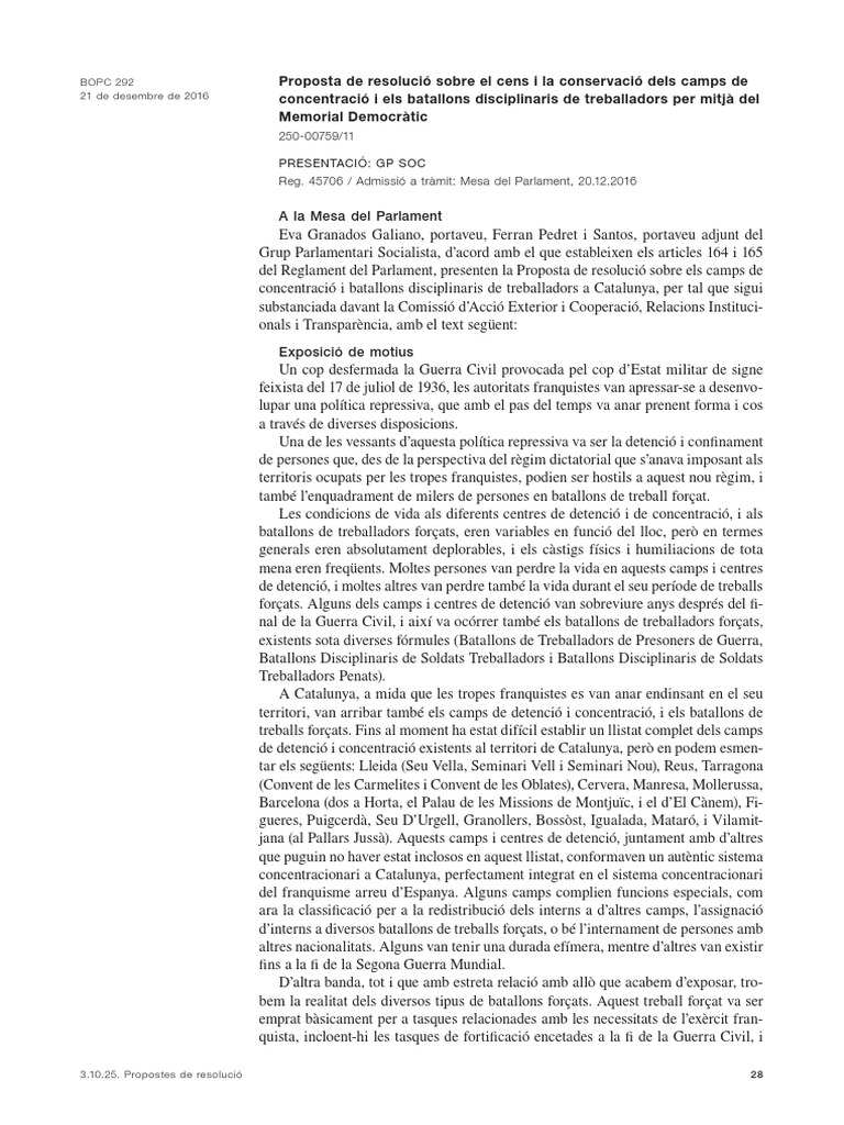 Eva Granados Galiano, portaveu, Ferran Pedret i Santos, portaveu adjunt del Grup Parlamentari Socialista, d’acord amb el que estableixen els articles 164 i 165 del Reglament del Parlament, presenten la Proposta de resolució sobre els camps de concentració i batallons disciplinaris de treballadors a Catalunya, per tal que sigui substanciada davant la Comissió d’Acció Exterior i Cooperació, Relacions Instituci-onals i Transparència, amb el text següent: