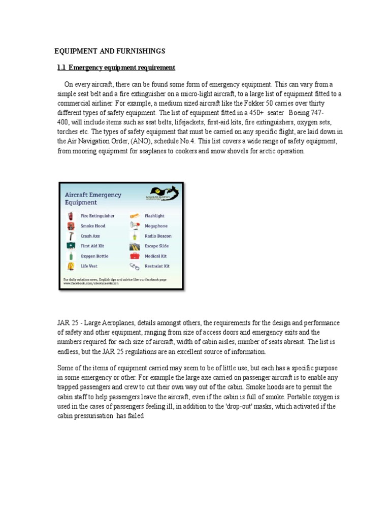 different types of safety equipment. The list of equipment fitted in a 450+ seater Boeing 747400, will include items such as seat belts, lifejackets, first-aid kits, fire extinguishers, oxygen sets,