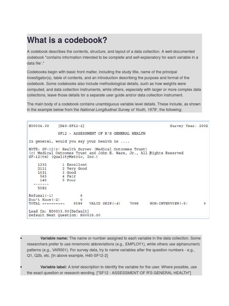 codebook "contains information intended to be complete and self-explanatory for each variable in a