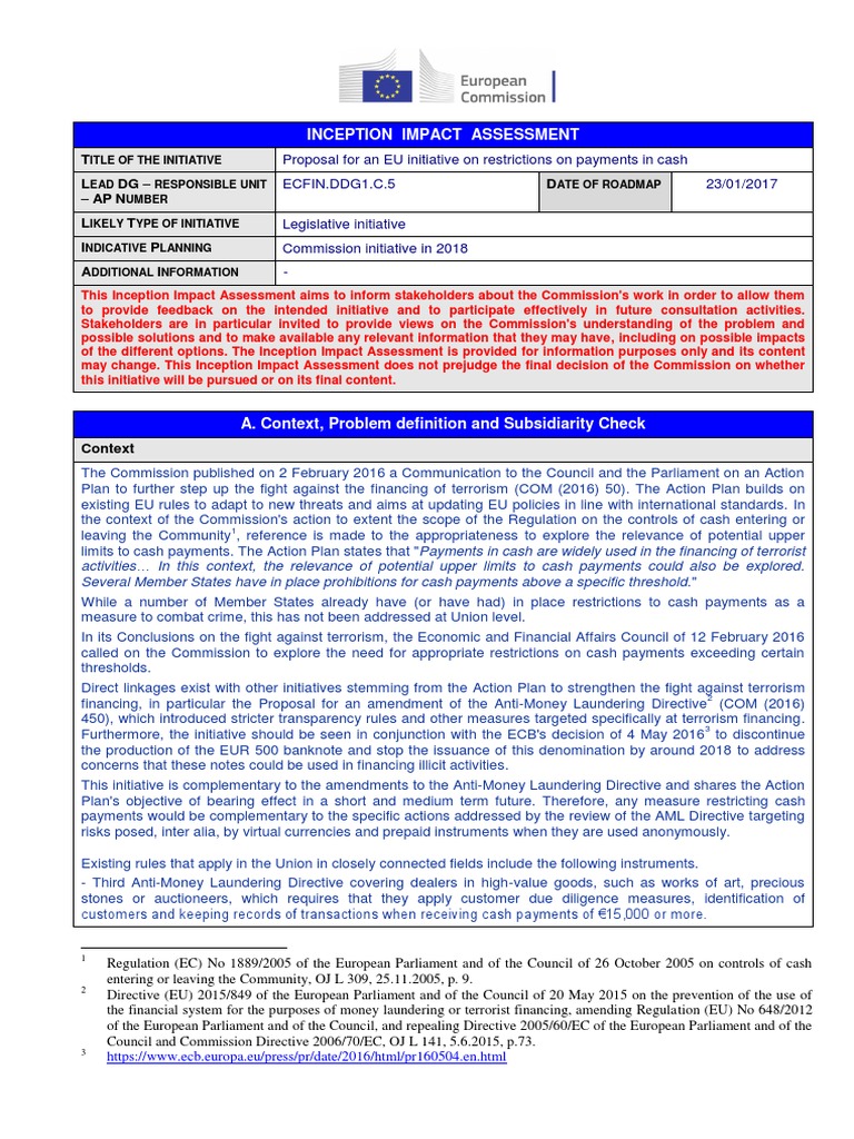 or more. The initiative has also direct linkages with the Proposal for an amendment of the Regulation on the controls of cash entering or leaving the Community (COM (2016) 825) and both frameworks should be coherent. In general, it is important to remember that cash is also the most accessible means of payment, and remains widely used. An important part of the public regards payment by cash as a personal freedom. Any change of policy would therefore be quite sensitive, and should start from the assumption that many could oppose restrictions on the use of cash and that such opposition could be built on sensible arguments