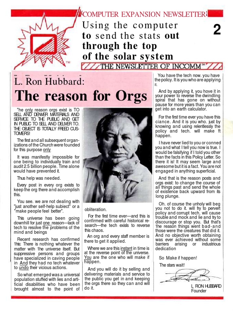 for this purpose only It was manifestly impossible for one being to individually train and audit 2.5 billion people. Time alone would have prevented it. Thus help was needed. Every post in every org exists to keep the org there and accomplish this. You see. we are not dealing with "just another self-help subiect" or a "make people feel better". This universe has been going downhill for just one_reason—lack of tech to resolve the problems of the mind and beings Recent research has confirmed 1his: There is nothing whatever the matter with 1he universe itself. But suppressive persons and groups have specialized in caving people in And they had no tech whatever to undo their vicious actions. So what emerged was a universal population stuffed with lies and artificial disabilities who have been brought almost to the point of obliteration. For the first time ever—and this is confirmed with careful historical research—the tech exisls to reverse this chaos. An org and every staff member is there to get it applied. Where we are this instant in time is at the reverse point of the universe. You are the one who will make if happen. And you will do it by selling and delivering materials and service to the public you get in and keeping the orgs there so they can and will do it. You have the tech now. you have