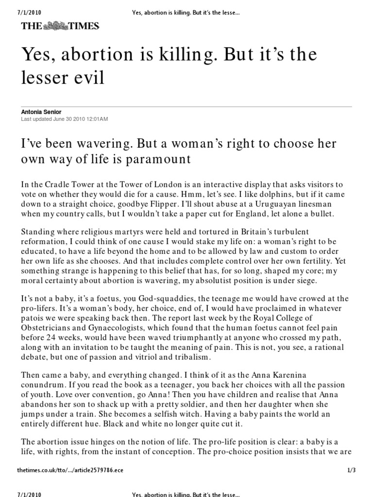 Antonia Senior, “Yes, Abortion is Killing. But It’s the Lesser Evil,” The Times {London], Wednesday, June 30, 2010. (requires registration) where she argues that life does begin at conception but suppressing women's rights (to abort) is the greater evil.