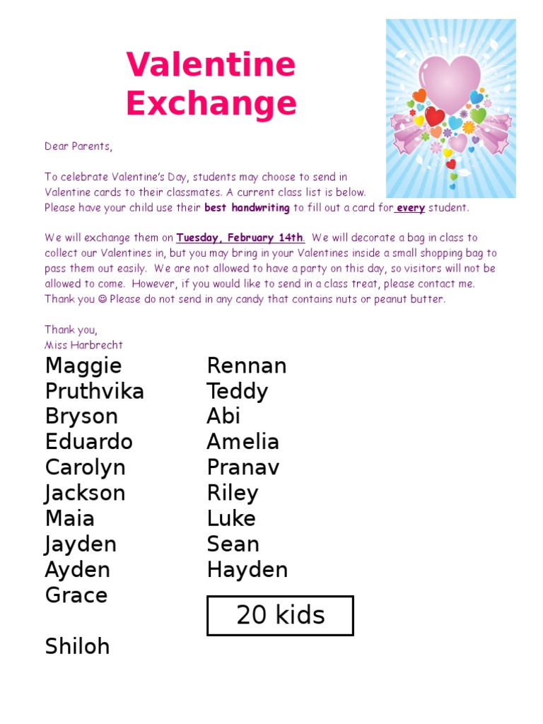 Valentine cards to their classmates. A current class list is below.