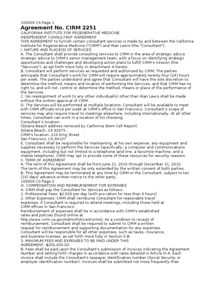 IX. PROPERTY RIGHTS, INCLUDING PATENTS AND COPYRIGHTSAll written and other tangible material produced pursuant to this Agreement by the Consultant("Material") shall be considered a work-made-for-hire under the Copyright Act. To the extent saidMaterial does not qualify as a work-made-for-hire, Consultant hereby assigns all rights, title, andinterest, including, but not limited to, copyright and all copyright rights in the Material to CIRMand shall execute any and all documents necessary to effectuate such assignment. In the eventConsultant uses any individual who is not a full-time employee of Consultant or uses any otherentity to perform any of the work required by Consultant hereunder, Consultant shall require saidindividual or entity to sign an agreement before commencing work that contains identical wordingto the foregoing two sentences except that the word "Consultant" shall be replaced with theindividual's or entity's name.100609 CS Page 4X. CONSULTANT'S LIABILITY AND INSURANCE REQUIREMENTSA. The Consultant agrees to defend, at CIRM's election, indemnify, and hold harmlessCIRM, its officers, agents, and employees from and against any and all claims, losses,expenses (including costs and reasonable attorney's fees), claims for injury, or damagesthat are caused by or result from the negligent or intentional acts or omissions of theConsultant, its officers, employees, or agents or Consultant’s breach of this Agreement.In addition, Consultant agrees to defend, at CIRM’s election, indemnify, and holdharmless CIRM, its officers, agents, and employees from and against any and all claims,losses, expenses (including costs and reasonable attorney's fees), claims for injury, ordamages accruing or resulting to any and all contractors, subcontractors, suppliers, or anyother person, firm or corporation furnishing services or supplying goods in connectionwith Consultant's performance of this Agreement.B. The Consultant shall furnish a Certificate of Insurance or statement of self-insurance(contractual liability included) showing minimum coverage as follows:1. General Liability: Comprehensive or Commercial Form (Minimum Limits)(i) General Aggregate (BI, PD)* $2,000,000(ii) Products, Completed OperationsAggregate $2,000,000(iii) Personal and Advertising Injury $1,000,000(iv) Each Occurrence $1,000,000* (not applicable to comprehensive form)However, if such insurance is written on a claims-made form following termination of this Agreement, coverage shall survive for a period no less than three years. Coveragemust include a Primary and Non-Contributory provision and a Severability of Interestprovision. Coverage shall also provide for a retroactive date of placement coincidingwith the effective date of this Agreement.2. Business Auto Liability: (Minimum Limits) for Owned, Scheduled, Non-Owned, or Hired Automobiles with a combined single limit of no less than$1,000,000 per occurrence.3. Workers’ Compensation: as required under California State Law.4. Professional Liability Insurance: (Minimum Limits)(i) Each occurrence $2,000,000(ii) Project Aggregate $2,000,000If this insurance is written on a claims-made form, it shall continue for threeyears following termination of this Agreement. The insurance shall have aretroactive date of placement prior to or coinciding with the effective date of thisAgreement. The insurance must include Contractual Liability Coverage andDefense and Indemnification of CIRM by the contracting party.5. Other insurance in amounts as from time to time may reasonably be required bythe mutual consent of CIRM and the Consultant against such other insurablehazards relating to performance.Certificate(s) shall name CIRM as an additional insured under 1, 2 and 4 above, obligatethe insurer to notify CIRM at least thirty (30) days prior to cancellation of or changes in100609 CS Page 5any of the required insurance and include a provision that the coverage will be primaryand will not participate with nor be excess to any valid and collectible insurance program