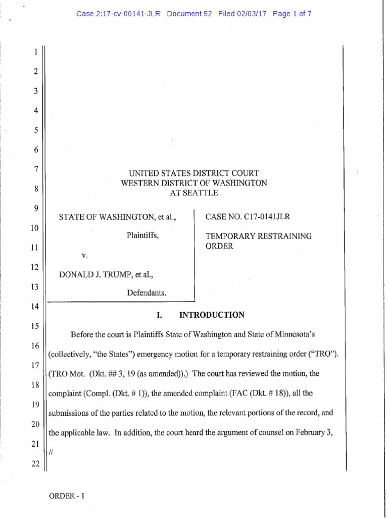 TRO in State of Washington v. Trump issued by U.S. District Court Senior Judge James L. Robart U.S. District Court Western District of Washington regarding President Trump'ss Muslim Ban Exec…