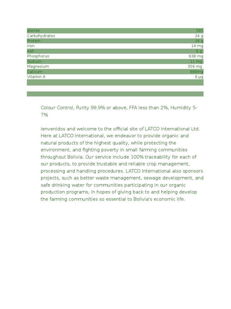 Colour Control, Purity 99.9% or above, FFA less than 2%, Humidity 5-