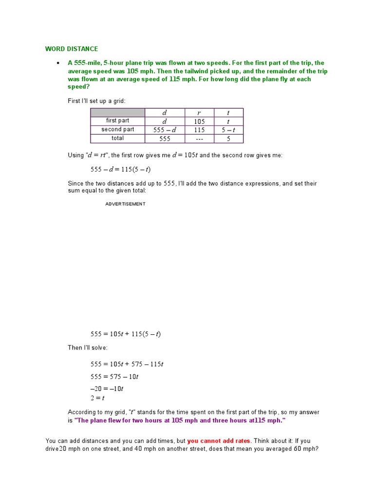 is "The plane flew for two hours at 105 mph and three hours at115 mph."