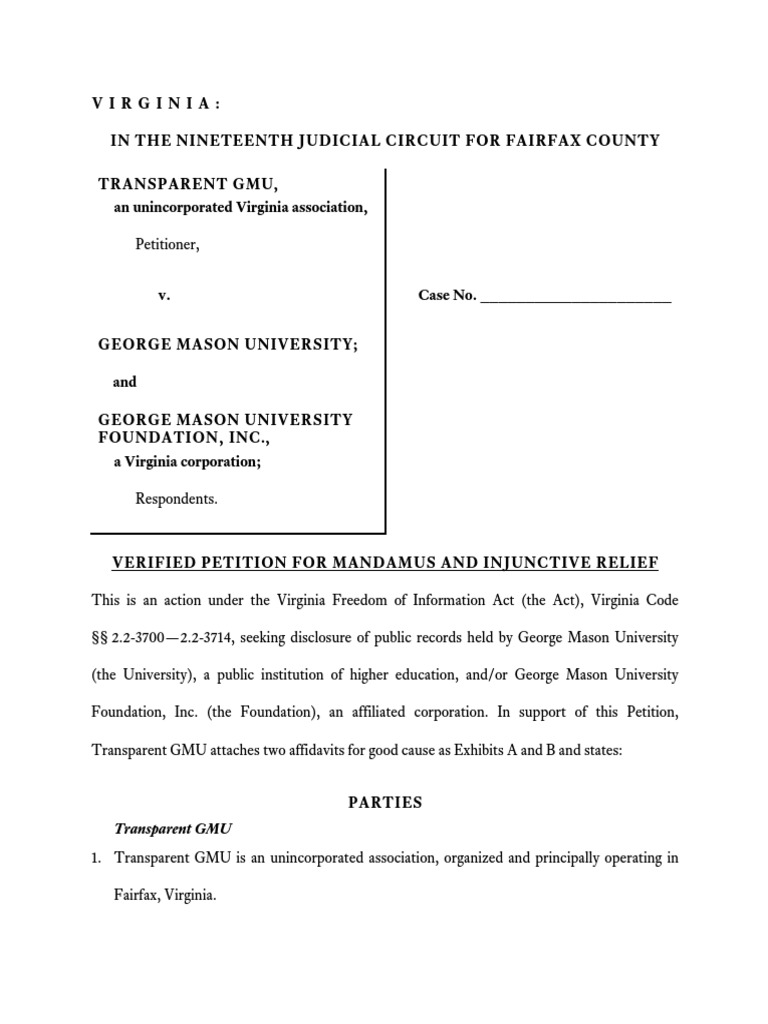 Legal petition filed by George Mason University student group Transparent GMU on February 9th, 2017 against George Mason University and the GMU Foundation.