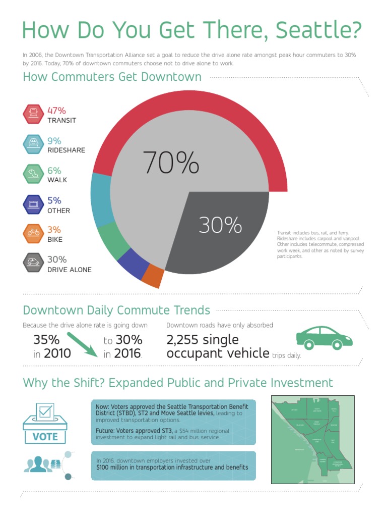 In 2006, the Downtown Transportation Alliance set a goal to reduce the drive alone rate amongst peak hour commuters to 30% by 2016. Today, 70% of downtown commuters choose not to drive alone to work.