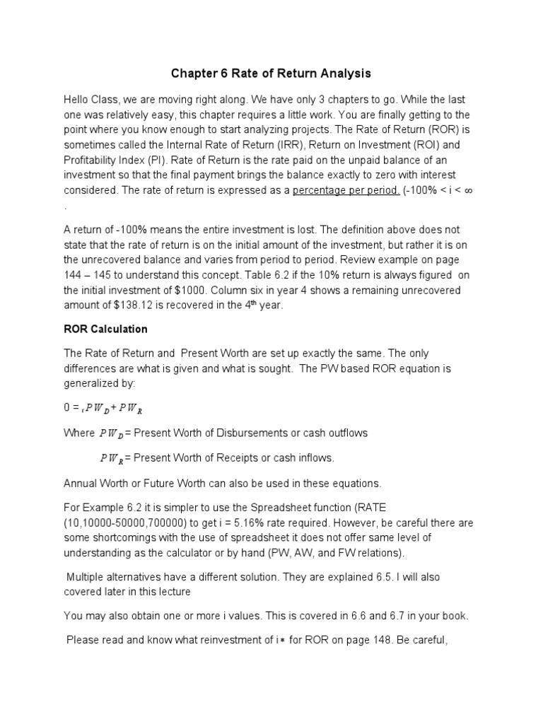 point where you know enough to start analyzing projects. The Rate of Return (ROR) is