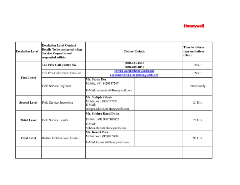 Escalation Level Contact Details representatives