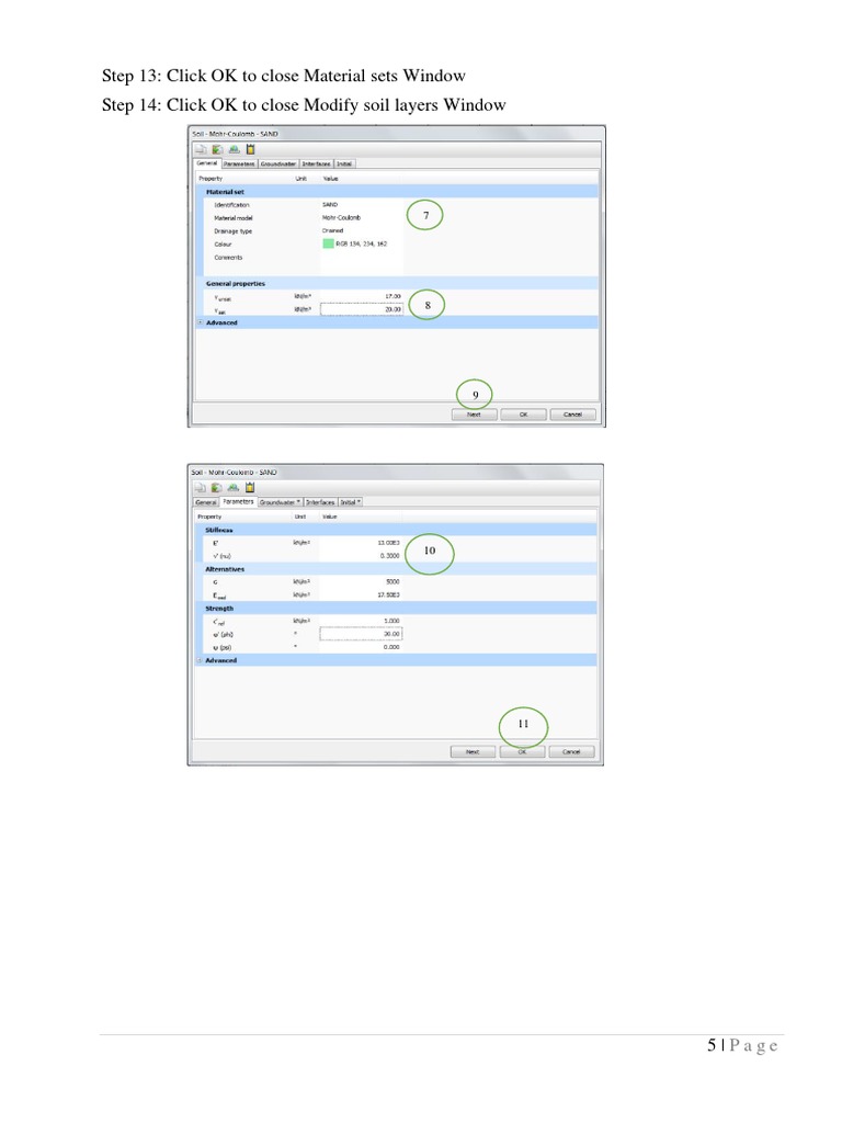 The document provides instructions for modifying soil layers in a software program. It involves opening a modify soil layers window, making changes to the material sets, and then closing both the material sets window and modify soil layers window by clicking OK.