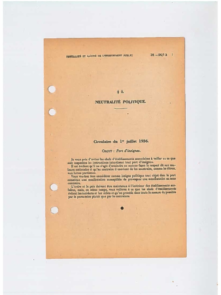 Circulaire émise par le ministre de l'Education nationale, Jean Zay, à destination des recteurs, sur le port d'insignes politiques dans les établissements secondaires.