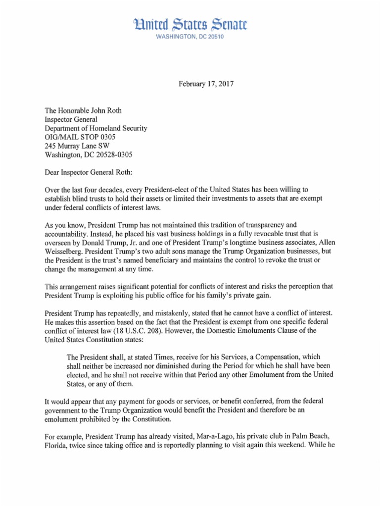 284 views3 pagesUdall, Democrats Letter to DHS Demanding Investigation Into Conflicts and Domestic Emoluments