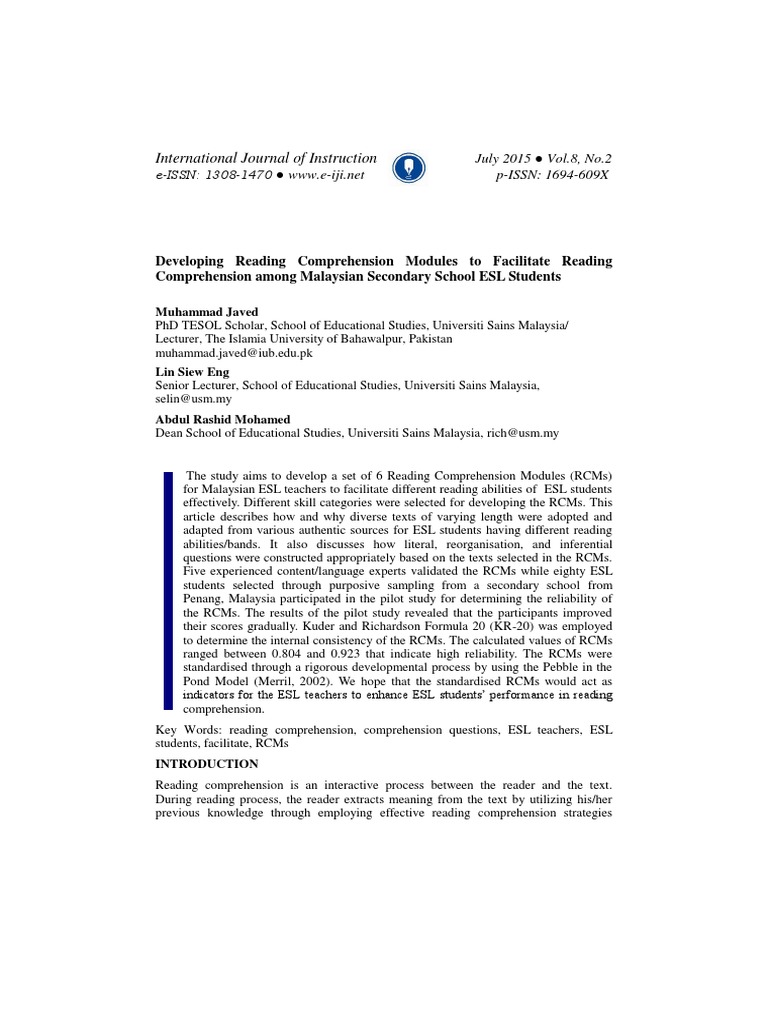 facilitate ESL students reading comprehension abilities at secondary school level in