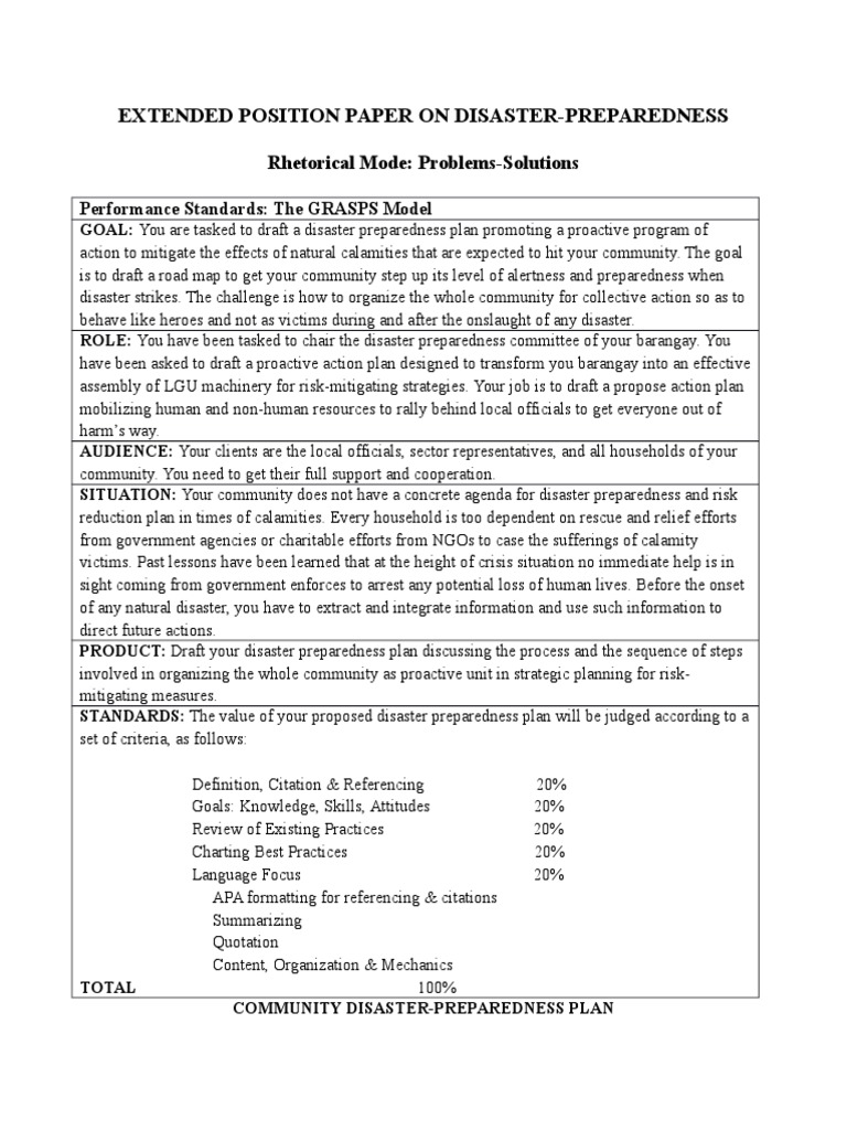 EXTENDED POSITION PAPER ON DISASTER-PREPAREDNESS