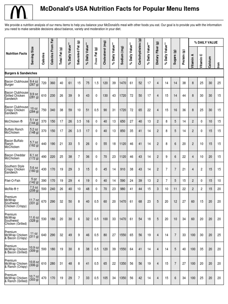 McWrap Chicken 10.8 oz 610 280 31 48 8 41 0.5 65 22 1350 56 56 19 4 15 7 27 100 20 20 20