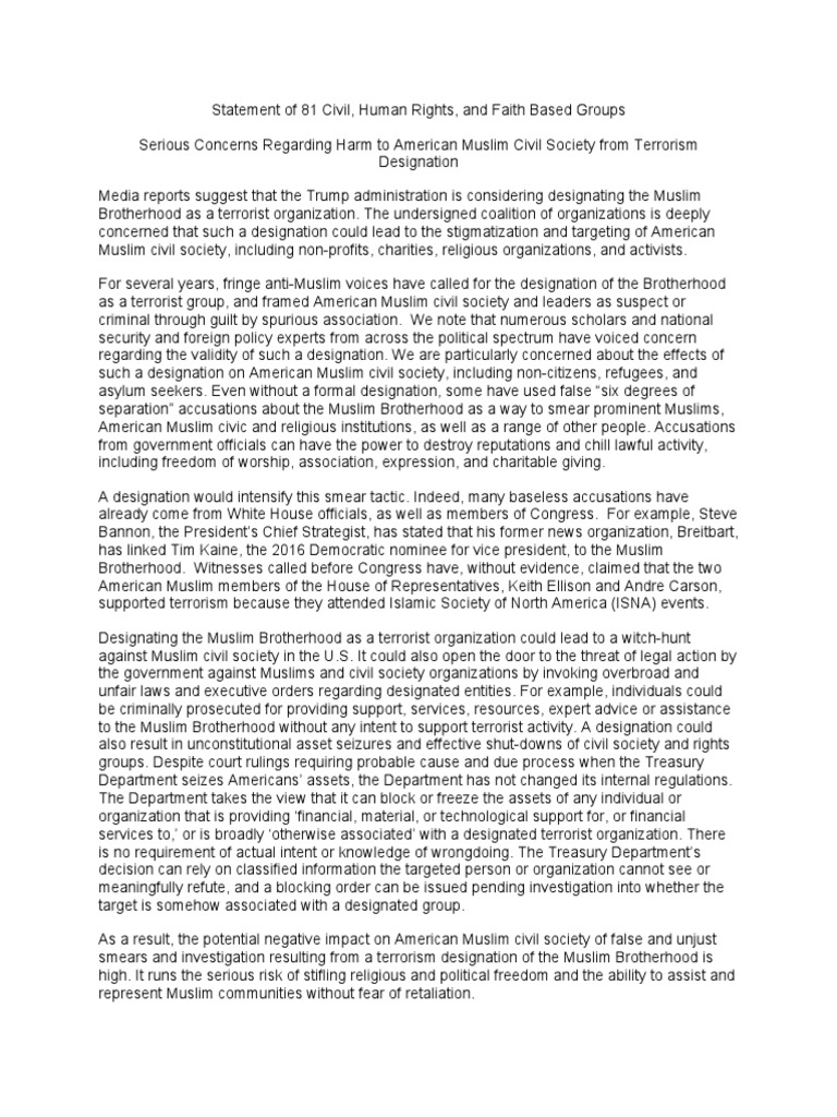 Brotherhood as a terrorist organization. The undersigned coalition of organizations is deeply
