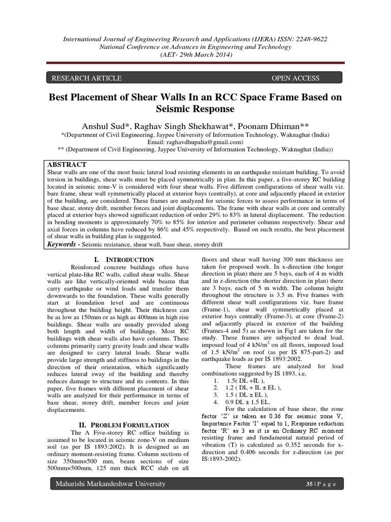 torsion in buildings, shear walls must be placed symmetrically in plan. In this paper, a five-storey RC building