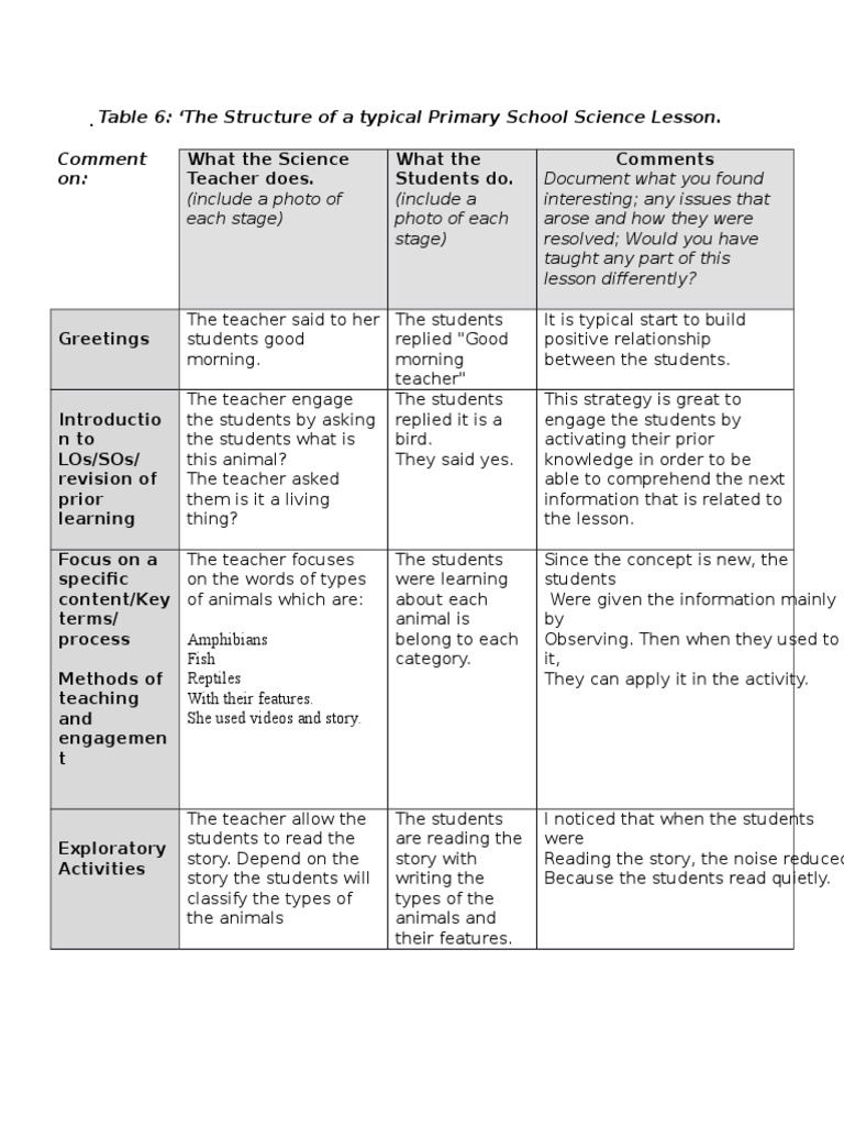 Table 6: The Structure of a typical Primary School Science Lesson.