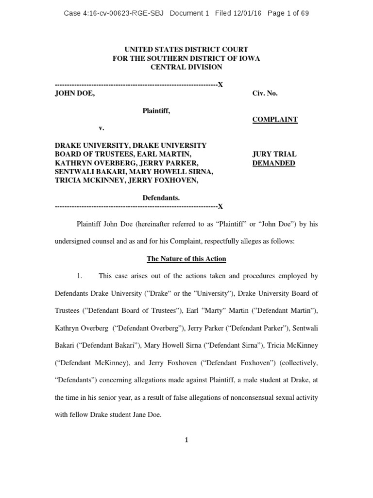 seeks relief against Drake following Drake’s wrongful and unjustified imposition of sanctions based on a fellow Drake student’s false and unproven allegations of sexual misconduct, as well as Drake’s failure and refusal to investigate or report John Doe’s own allegations of sexual misconduct. This injustice was the direct result of Drake’s failure to (1) conduct an adequate investigation, (2) provide Plaintiff with due process as defined by Drake’s own policies, and (3) excessively focus on the concerns and interests of the female complainant and the convenience of the University to the total exclusion of the rights and interests of the male respondent John Doe. 3.