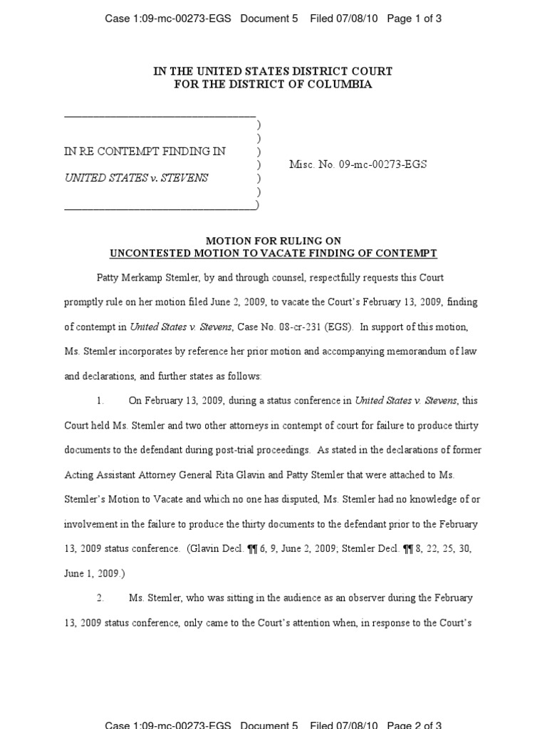of contempt in United States v. Stevens, Case No. 08-cr-231 (EGS). In support of this motion,