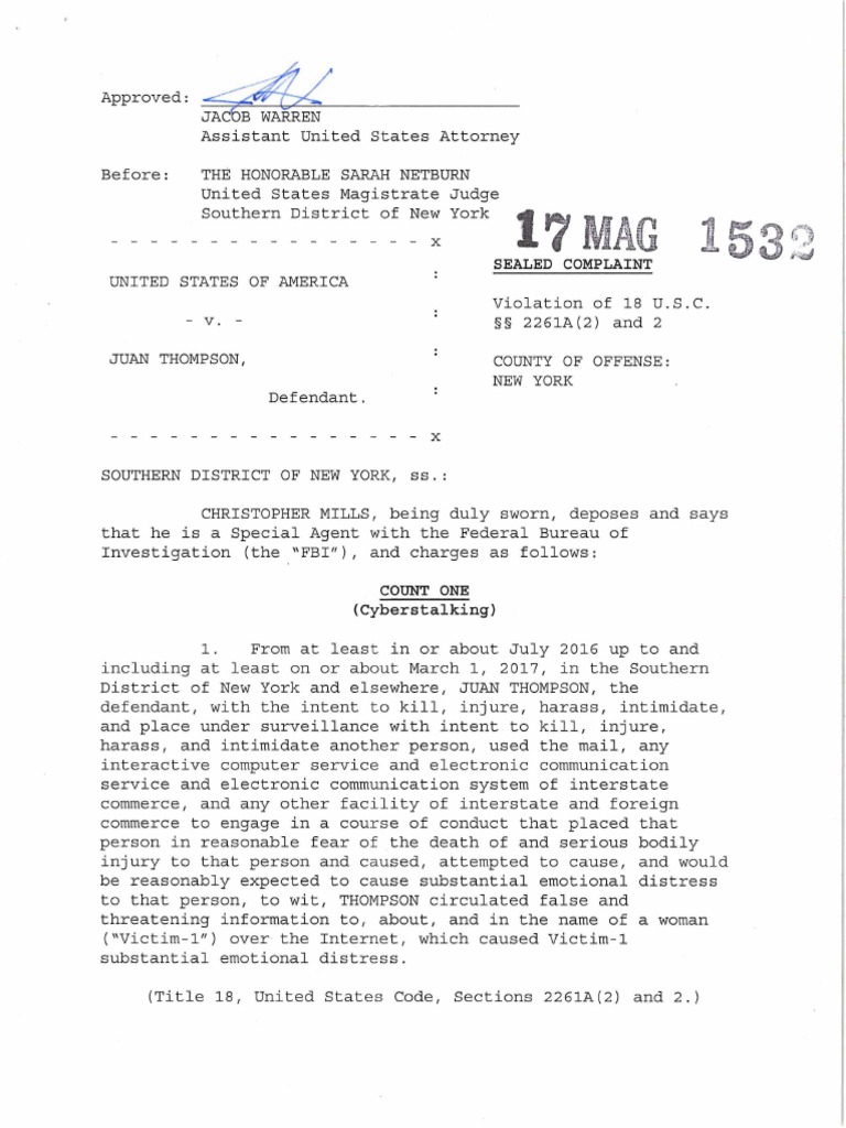 Authorities identified the suspect as 31 year-old Juan Thompson. He is charged with one count of cyber-stalking, which carries a maximum sentence of five years.